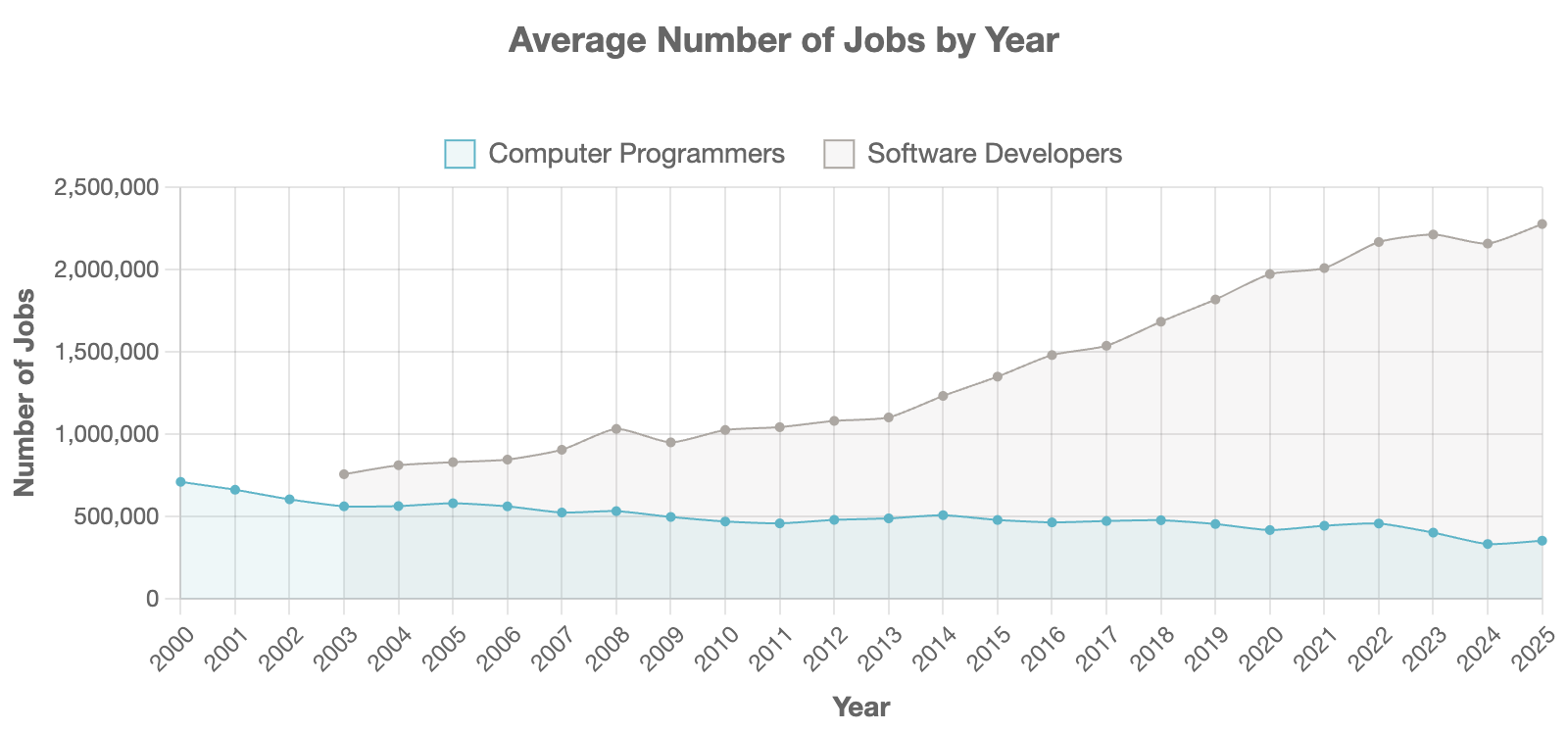 The Washington Post data team recently analyzed the reported loss of programmer jobs over the last twenty years. It's an excellent article that would seem to validate the theory that all devs will be replaced by AI in the next few years. But when they dug into the data they found that "programmer" is differentiated from "developer." According the labor bureau, a programmer is a low-level coder, executing on specifications, whereas a developer is a higher level planner and architect of code. So a programmer is a dishwasher and a developer is a chef. In truth, many of these types of jobs have moved offshore or are reserved for very junior developers.